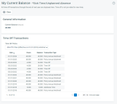 Under Available Balance, click the balance link to open the My Current Balance page. It displays the current balance for the time-off category that is indicated in the title bar.