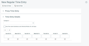 Use the same Summary and Internal Notes for all days This check box is selected by default. The same summary notes and internal notes will be applied to all time entries. To enter a different note for each date, clear the check box.