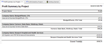 Displays financial details for the project. View breakdowns and totals for Expenditures, Revenue, Profits and Projected Revenue. In addition, the report also displays all tasks along with task status, estimated hours, hours worked, hours and amount posted and cost. |