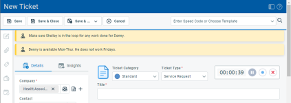 Ticket Alerts | This alert appears on the New Ticket, Ticket Detail, Edit Ticket and Ticket Time Entry pages for all tickets for this organization. |