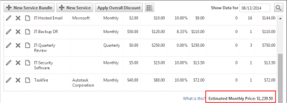 NOTE  If there is no full period record for the service/bundle (the service was added part-way through the period that you are viewing data for), the Estimated (Monthly) Price will calculate the full period price for that service/bundle and use that in the calculation.