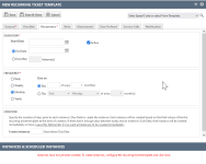 On the Recurrence tab, you define the duration and frequency of the recurrence, which in turn will determine the number of instances (tickets) that will be created, and their due dates. You'll also specify the number of days prior to each due date that the instances will be created.