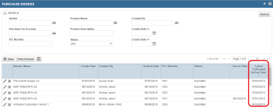 You can specify an estimated arrival date on purchase order items. The Estimated Arrival Date field appears on the Purchase Order Item page Memo form. There is also an Estimated Arrival Date window that will open when you submit a purchase order. From this window you can specify an estimated arrival date for any items on the purchase order that do not have a date specified.