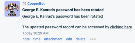 Cooper Bot is a system API user that appears as the actor for workflows that are automatically initiated (triggered) in other Kaseya IT Complete modules. There is no charge for system resources, and they cannot be edited. To prevent changes, all menu options are disabled for the Cooper Bot system resource.