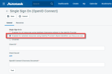IMPORTANT Since Azure AD and Entra ID do not support exposing custom attributes via OpenID Connect (i.e. setting the autotaskusername value for a user within the IdP), in Autotask, Azure AD and Entra ID clients must use the Enabled for selected resources using Identity Provider's Name Identifier option, where the user's unique ID from the IdP is set on the Autotask SSO page.
