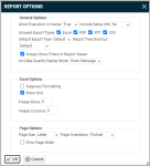 The settings on the Report Options window determine if the report can be run in HTML format (in the Viewer), what the default and the allowed export settings are, and other settings that determine the look and feel of the generated report.