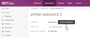 This insight will show relevant passwords from IT Glue. For this insight to appear for a resource, the IT Glue integration must be enabled and the resource must have connected to their IT Glue account on their profile page. Refer to Integration with IT Glue and Managing your profile. When a ticket with an IT Glue insight is viewed, the following will happen:
