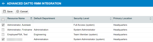 - The Advanced Datto RMM Integration page lists all active resources. Select the check box next to the resource(s) for whom you would like to activate the integration. To enable access for all active resources, click the Select All check box in the header row.