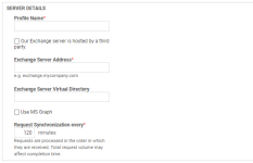 Request Synchronization every* | Enter the synchronization interval, in minutes. The interval must be at least 10 minutes, but note that the actual synchronization time may be longer, depending on other items queued up at the MS Exchange Server. If you receive an error such as "We are unable to save your changes at this time because there is a sync in progress, please try later," increase the Request Synchronization every interval to at least an hour to ensure that the new sync will not begin before the previous one has ended. Once the sync has completed, save your changes and optionally adjust the time back. |