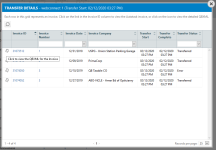 Each row on a Transfer Details dialog page represents one item (invoice, expense report, timesheet, purchase order) in the batch.