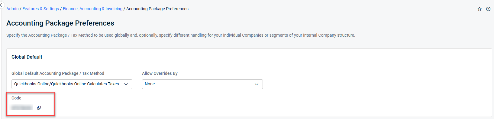 1. In Autotask, go to Left Navigation Menu > Admin > Features & Settings > Finance, Accounting & Invoicing > Accounting Package Preferences.
